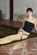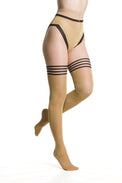 Elevate your look with these elegant tights featuring a chic imitation hold-up design in shimmering gold lurex. Minimal black detailing on the top and panty adds a refined, modern touch. Designed for all-day comfort, they feature a soft waistband, a flat four-needle seam, and a foot-shaped article for a perfect fit. Finished with an invisible toe for a seamless, polished appearance.